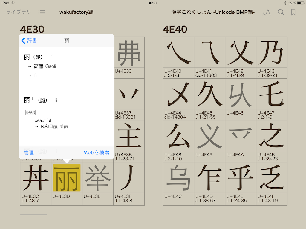 漢字を選択して辞書を引くことができます。iOSでは、中国語辞書をインストールしておくとよいでしょう。